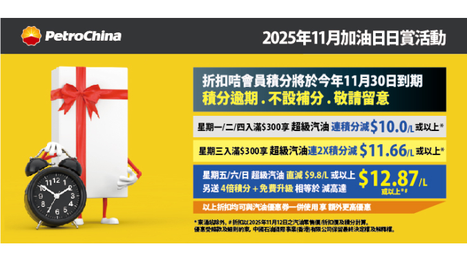 ^ 优惠以2025年11月11日油站油品零售价及折扣,连同以最高积分兑换最高金额的燃油礼券计算。优惠以单一交易折扣后的金额计算,并只适用于已参加积分计划之折扣咭会员。中国石油国际事业(香港)有限公司 ("中国石油") 有权随时更改、暂停、取消此推广活动或修订其条款细则之权利,恕不另行通知。如有任何争议,中国石油保留此推广活动的解释权及最终决定权。
